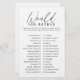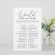 Dit elegante "Would She Rather" bruidsjurk spel heeft een chic script lettertype in klassiek zwart en wit voor een schone, minimalistische look. Dit bruidsjurk spel is perfect om de gasten betrokken en enthousiast te krijgen over het aankomende huwelijk van de bruid op een luchtige manier. De "Would She Rather" vragen zijn leuk, ondeugend en geven inzicht in de smaak, interesses en voorkeuren van de bruid. Terwijl de gasten debatteren over wat de bruid zou kiezen, zullen gelach en nieuwe gesprekken op gang komen! Het Elegante Script "Would She Rather" spel zal je bruidsfeestje een geraffineerd en speciaal tintje geven. Bestel dit must-have bruidsjurk spel vandaag nog om de bruid te verrassen en de gasten te verwennen!