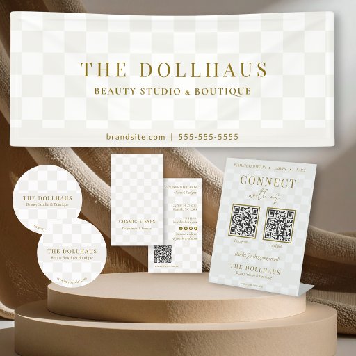 The elegant checkered business display sign features a light tan retro checker background with gold elegant text. Add your business name and tagline to the front of the featuring a sleek background with elegant serif font. The scannable sign features double QR code to help your visitors turn into followers and shoppers! Perfect for your vendor table, trade shows, boutiques and more!