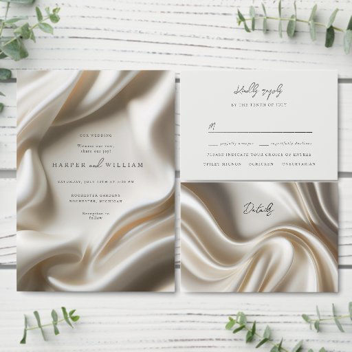 A luxurious white satin-inspired wedding invitation featuring softly draped fabric for a timeless, elegant look. The backside includes the phrase “Forever begins here,” which can be customized or removed to suit your style. Perfect for couples who love modern simplicity with a touch of luxury.