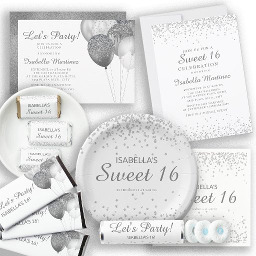 Zoete uitnodiging van 16 verjaardagsfeestjes in wit met zilveren glitter en een elegante kalligrafie/scriptdoopvont. Neem contact met ons op voor hulp bij aanpassingen of om passende producten aan te vragen.