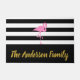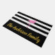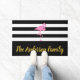 Laat je bezoekers weten dat ze het juiste huis hebben bereikt. U kunt de naam van uw familie toevoegen in faux goudscript op de brede zwarte streep onderaan. De achtergrond is zwarte en witte strepen. Een roze flamingo is boven de tekst.