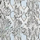 Dit ingewikkelde zwart-witte bloemige ontwerp heeft een herhalend patroon van delicate bloemen en wijnstokken, tegen een zachte, lichtblauwe achtergrond. De symmetrische lay-out geeft het een , art nouveau gevoel.