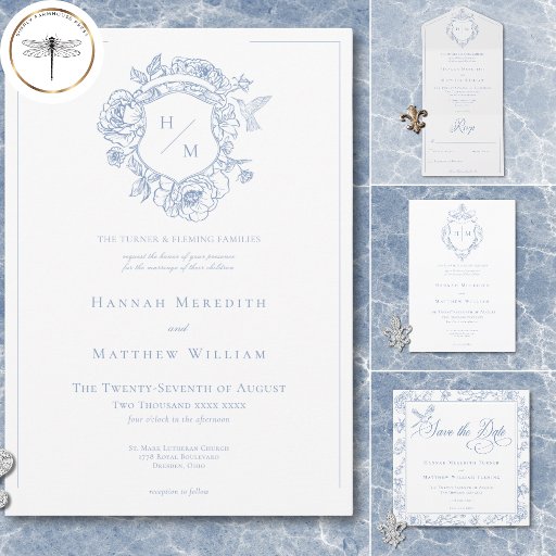 Elegant Blue Chinoiserie Bird & Crest WeddingOntworpen door Kathe Santillo