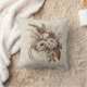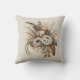 Kussen met een boeket van perzikbloemen, omgeven door bruinachtig bronsgrassen en gebladerte met veren accenten. Een licht bruinachtige crèmekleurige achtergrond met een zwak damast patroon.