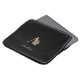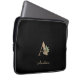 Elegante zwarte laptophoes met een gouden botanische monogram in het midden.
