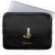 Elegante zwarte laptophoes met een gouden botanische monogram in het midden.