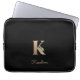 Elegante zwarte laptophoes met een gouden botanische monogram in het midden.