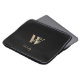 Elegante zwarte laptophoes met een gouden botanische monogram in het midden.