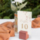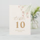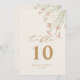 Een vrijstaande tafelnummerkaart versierd met delicate illustraties van wilde bloemen.