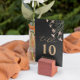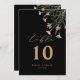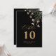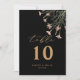 Een vrijstaande tafelnummerkaart versierd met delicate wildflower illustraties op een zwarte achtergrond.
