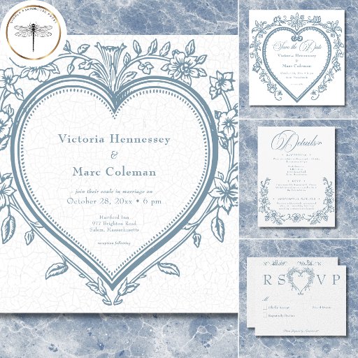 Leg tijdloze romance vast met onze geïnspireerde trouwkaart zonder dinerkeuzes. Dit elegante ontwerp heeft een witte achtergrond die lijkt op gebarsten porselein, wat een klassieke Victoriaans antiek charme oproept. In het midden, een prachtige stoffige blauwe chinoiserie bloemenhart zit boven uw gegevens in prachtig typografie. De achterkant toont een bijpassend bloemenhart, waardoor een samenhangend en onvergetelijk ontwerp ontstaat. Perfect voor koppels die houden van ouderwetse elegantie met een moderne twist. Creëer door Simply Farmhouse Press.