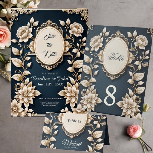 Prachtige diepblauwe achtergrond met elegante crèmekleurige bloemen. Deze combinatie symboliseert de diepte van onze verbinding en de tederheid van onze gevoelens voor elkaar.