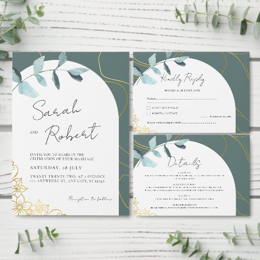 Vier uw speciale dag met deze eucalyptus huwelijksuitnodiging met gouden folie accenten en een modern boogontwerp. Het waterverf groen zorgt voor een frisse, organische touch, terwijl de subtiele bloemengouden details tijdloze sophisticatie toevoegen. Ideaal voor koppels die op zoek zijn naar een chique, botanisch geïnspireerde trouwsuite, deze sjabloon kan worden aangepast met uw namen, trouwdatum, locatie en alle details van het evenement. Coördineert prachtig met RSVP-kaarten, Sla de datums, buikbanden en enveloppen op voor een complete bijpassende set.