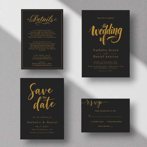 Deze elegante zwart-gouden huwelijksuitnodiging is perfect voor een moderne bruiloft. Het eenvoudige ontwerp is voorzien van elegante gouden kalligrafie op een zwarte achtergrond. De uitnodigingskaart bevat de huwelijksdetails op de achterkant in plaats van te betalen voor een afzonderlijke behuizingskaart.
