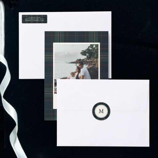 Moderne kersttafelloper met een tijdloos ontwerp met uw monogram over een gedempte marineblauwe en groene plaid achtergrond.