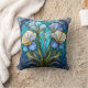 Moderne kleurrijke kussensloop bedrukt met een Art Nouveau glas-in-lookalike patroon met irisbloemen in een moderne blauw, blauwgroen en pastel paarse tinten.