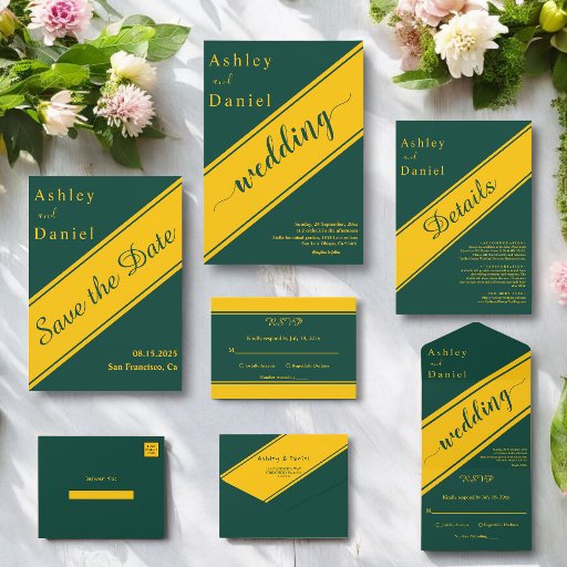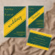Deze elegante groene en gouden huwelijksuitnodiging is perfect voor een moderne bruiloft. het eenvoudige ontwerp is voorzien van elegante gouden kalligrafie op een groene achtergrond.