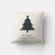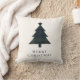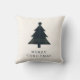 Modern kerstkussen met een tijdloos ontwerp met een kerstboom met een gedempt marineblauw en groen geplakt patroon samen met de begroeting "Merry Christmas".