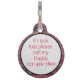 Dit elegante label heeft een oosters Antiek Perzisch tapijtpatroon, voornamelijk in de kleuren rood, donkerblauw en wit. Een sjabloon is voorzien voor u om het label voor uw pup te personaliseren. De keerzijde personaliseer je om te zeggen wie je moet bellen en het nummer, als de hond verloren is.