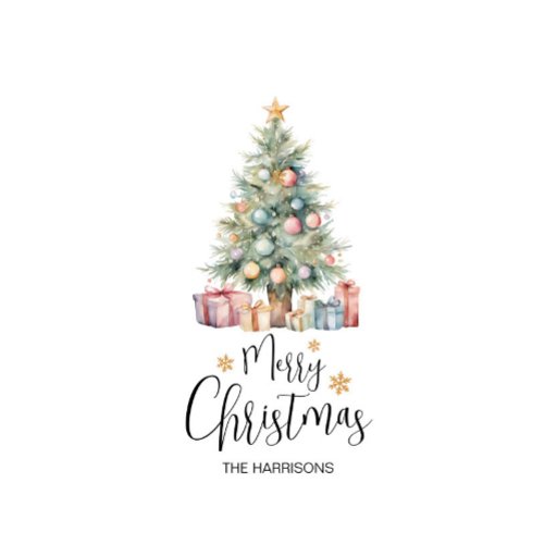 Maak uw vakantie groeten extra speciaal met deze gepersonaliseerde kerstkaart met een delicate waterverf kerstboom en prachtig verpakte geschenken eronder. Het mooie "Merry Christmas"-bericht wordt aangevuld met de mogelijkheid om jouw naam of familienaam toe te voegen, waardoor een warme en betekenisvolle toets ontstaat.