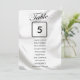 Vergroot de allure van uw trouwinrichting met deze gepersonaliseerde tafelnummerzitkaarten, zorgvuldig vervaardigd voor een luxe en modern feest. Met een glanzende witte zijden achtergrond en elegante cursieve typografie belichamen deze kaarten een minimalistische verfijning. Ontworpen om een naadloze zithouding te garanderen, begeleiden ze gasten moeiteloos naar hun aangewezen zitplaatsen terwijl ze uw tafelkleed accentueren met een vleugje ingetogen grandeur. Deze kaarten zijn volledig aanpasbaar en stellen u in staat om gastnamen samen met tabelnummers weer te geven, waardoor een doordachte, persoonlijke touch aan uw evenement wordt toegevoegd. Deze kaarten onderscheiden zich van conventionele design en geven de voorkeur aan strakke contouren en eigentijdse charme, ideaal voor koppels die waarde hechten aan sierlijke eenvoud. Laat uw bruiloft briefpapier straalt tijdloze sophisticatie en maak een onvergetelijke indruk op uw gasten.