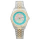 Dit elegante polshorloge voor haar heeft faux glitter, kleurrijke schelpen in meerdere kleuren van blauwgroen, koraalroze, aqua en goud. De schelpen zijn geplaatst op aquablauwe chevron strepen die ook afbeeldingen van het schelppatroon bevatten, en die zijn gecontrasteerd met witte chevron strepen. Witte diamantmakers op een band van bijpassende blauwgroen maken het horloge gemakkelijk leesbaar. Een gouden cirkelpatroon scheidt het lijst van de blauwgroen blauwe band. !