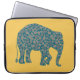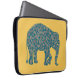 Een cool neopreen-Sleeve dat aan uw laptop is aangepast, met een ellefant silhouet, gevuld met een donkerblauw en een Bourgogne paisleypatroon op een gouden gele achtergrond die u kunt wijzigen als u dat wenst. In het collectie Posh & Painterly 'Heffalfels' kan dit ontwerp worden aangepast aan elke laptophoes.