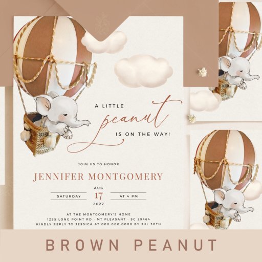 Een beetje pinda is onderweg. Deze kleine olifant wacht op het grote baby feest, in een hete luchtballon - geschilderd door mij. Whimsical-waterverven en de moderne typografie vormen een aanvulling op het ontwerp. Pas dit schattige Elephant punt van het Baby shower gemakkelijk en snel met uw baby shower details aan, druk de pas het knoop aan verder re-schikt, en formatteer de stijl en de plaatsing van de tekst.