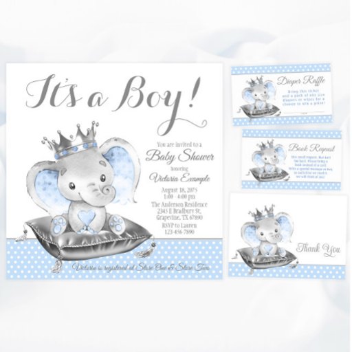 Olifant baby douche uitnodigingen met schattige baby boy olifant dragen een baby blauw en zilveren kroon zittend op een blauwe stip achtergrond. Deze jongen olifant baby douche uitnodigingen zijn eenvoudig aangepast voor uw evenement door het toevoegen van uw gegevens. Je kunt de kroon verwijderen en de achtergrond aan de achterkant.