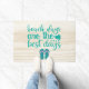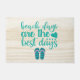 Cute doormat voor je strandhuis - "Beach Days is the Best Days" met leuke teenslippers in blauwgroen, jager en roze op een faux houthopende achtergrond.