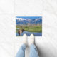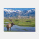 Dit buitenshuis themadoormat kenmerkt een adembenemende natuur scène met bergen, een koude waterstroom en een stier elelk. Het elek of de wapiti is een iconische inwoner van de Rocky Mountains in Noord-Amerika.