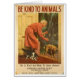 Een poster van de openbare dienst voor de Humane Society is voorzien van een afbeelding van een oudere heer en zijn huiskatje die de voordeur opent op een stormachtige, regenachtige nacht om een rilende, natte en angstaanjagende zwerfhond op hun deur te vinden. Het man buigt zich naar de hond om de hond te laten weten dat hij bereid is te helpen door de hond uit het weer te halen. Deze oude posters, die veel door Dennis Morgan zijn geïllustreerd, werden in de jaren dertig van de vorige eeuw geproduceerd voor de "Be Kind to Animals Week" van de American Humane Association. Elk Dennis Morgan poster had een kind dat een daad van vriendelijkheid jegens dieren uitvoerde. Verschillende bekende kunstenaars droegen gedurende de eerste decennia van "Be Kind to Animals Week", die in 1915 in de VS begon, een soortgelijke campagne in Engeland. De gedrukte posters in de VS werden naar lokale humane samenlevingen gestuurd met een lege ruimte onderaan waar de informatie van het plaatselijke bureau kon worden toegevoegd. Deze kaart is leeg binnenin voor je eigen bericht.