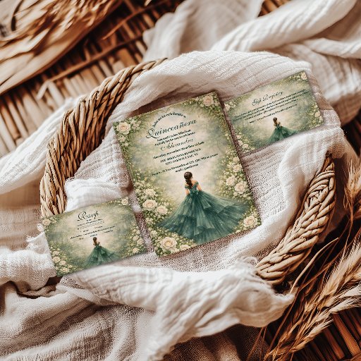 This elegant quinceañera design features a soft emerald green watercolor background framed by romantic ivory roses, delicate greenery, and subtle gold accents, with a graceful gown illustration creating a refined, enchanted garden atmosphere. The rich green palette combined with classic florals gives the design a luxurious yet youthful feel, perfect for a timeless quinceañera celebration with a romantic, nature-inspired aesthetic.