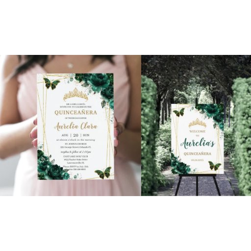 Emerald Green Floral Butterflies Quinceanera Programmakaart