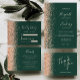 The left-hand edge of this elegant modern wedding invitation features a peach faux glitter border. The customizable text combines peach handwriting, copperplate and italic fonts on an emerald green background. The reverse side features a matching green and peach glitter design.