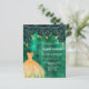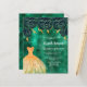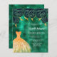 Een moderne, stijlvolle en glamoureuze uitnodiging voor een Quinceañera, 15e verjaardagsfeest. Een ingestudeerde smaragdgroene achtergrond met een faux gold jurk en groene rozen, bloemblaadjes. De naam is geschreven met een modern handschrift. Personaliseer en voeg uw feestdetails toe. 1 vel = 1 uitnodiging afgedrukt rand tot rand.