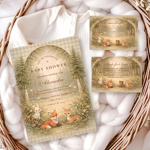 A heart-melting woodland design featuring a sweet gathering of forest friends beneath a soft storybook canopy. Fox, fawn, bear, raccoon, and bunny sit together in a warm autumn meadow framed by gentle trees and vintage parchment tones. The earthy palette and delicate botanical details create a cozy, nostalgic feel—perfect for a nature-inspired celebration. Fully customizable to make it uniquely yours.