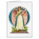 Retro-ogende engel met veterzandjes, leliebloemjurk en hoofdband met bloemetjes, en met een bos lelies in haar handen en armen, achter de engel is een grote blauwe schijf met planten, ze heeft grote roze vleugels en kijkt direct naar de waarnemer.Angel met lange jurk gemaakt van witte leliebloemblaadjes die er lieflijk met voetjes samen uitzien op een pad omringd door en het dragen van bruin romeinse zandjes. Mooie waterverf aquarel schilderij van Paasengel met traditionele paasbloemen. pastel pastelkleuren blauw, wit en roze kleuren.