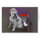 Een afbeelding van een blanke Engelse bulldog met een kalabaspijp en met een deerstalker pet (excuses aan Shirlock Holmes) en een Franse bulldog in een rode bes.