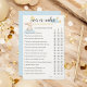Voor verdere aanpassingen kunt u een e-mail sturen naar hi.yellowmoonatelier@gmail.com. Voeg wat plezier toe aan je baby shower met de Some Bunny Starry Over of Under Guessing Game van Yellow Moon Atelier! Met een mooie waterverf van een konijntje dat op een wolk zit en een vrolijke, gele stervormige ballon vasthoudt, is dit spel ideaal om je gasten te vermaken. Elke instructie bevat een cijferwaarde en gasten zullen moeten raden of het werkelijke aantal voorbij, onder of spot-on is. De gast met de meest correcte antwoorden wint! Zorg ervoor dat je van tevoren de juiste antwoorden weet en vergeet niet om een leuke prijs voor de winnaar te pakken! Dit heerlijke spel voegt een extra vleugje plezier en opwinding toe aan je baby shower. Vergeet niet om het Some Bunny Starry Baby shower Collectie te verkennen voor meer coördinerende items om uw feest te voltooien!