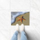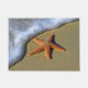Opvallende strandfoto's, een heldere oranje zeester op de rand van het water die door een zachte golf wordt bedekt.