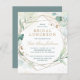 Moderne budgetbrudale luncheon-uitnodiging met een geometrisch lijst omringd door eucalyptusbladeren en groen. Binnenin zijn de details van uw evenement donkergroen samen met de titel en de naam van de bruid in een elegante gouden toon, boven een pastelachtige waterverf met spugen van faux goudglitter. De achterkant is een overeenkomende schaduw van zacht blauw groen. Deze eenvoudige, rustige uitnodiging is geweldig voor een botanische bruidmaanie. Deze goedkope bruidmakreeluitnodigingen zijn op vellen papier gedrukt voor een budgetvriendelijke optie.