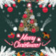 Dit is een vrolijk kerstontwerp met gouden kerstboom, kerstverlichting, sneeuwvlokken en donkergroene achtergrond met duizenden sterren.
