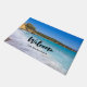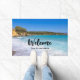 Welkom deurmat met een foto met een strand op het Griekse eiland Kreta. Een prachtig tropisch blauw strand met schuimend surf. Prachtige rustige reisbestemming.