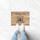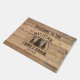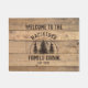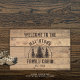 Rustieke cabine welkom deur mat met bruin verweerde houten planken en bos bomen ontwerp gepersonaliseerd met WELKOM BIJ DE NAAM FAMILIE CABINE en jaar gevestigde datum of andere tekst in bruin. ASSISTENTIE: Voor hulp bij het aanpassen of personaliseren van het ontwerp, het veranderen van de kleur, het vergroten of verkleinen van het ontwerp of het overbrengen van het ontwerp naar een ander product, neem contact op met de ontwerper VOORDAT U BESTELT via het Zazzle Chat MESSAGE tabblad of e-mail makeitaboutyoustore@gmail.com.