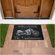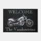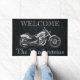 Een motorfiets is een mat die gepersonaliseerd kan worden met elke familienaam. De achtergrond is voorzien van een ruitvormig bord. Deze aangepaste welkomstmat is perfect voor de familie die graag op hun motorfiets rijdt.