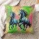 Een levendige weergave van de galopperende paarden. Het toont een dynamische mix van blauw en goud, met de nadruk op de vloeiende manen. Kleurrijke groene, gele, roze mist achtergrond,