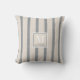 Aangepaste moderne boerenhok gooit kussen met je monogram en familienaam op een beige en blauwe boerenetter.