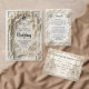 Announce your formal estate wedding with timeless elegance. This vintage-inspired design captures the romance of European architecture in a luxury cream palette. Experience the grandeur of an old-world celebration through this intricate illustration. The design centers on a symmetrical view of a majestic cathedral featuring twin spires, accessible via a tree-lined garden pathway. The central scene is framed by elaborate, digitally sculpted scrollwork and blooming rose clusters that simulate the appearance of chiseled stone or plaster relief. The typography blends flowing, elegant handwriting for names with classic serif fonts for details, all rendered in soft shades of warm beige, tan, and ivory for a sophisticated monochromatic look. This is a flat printed image with a faux embossed stone effect, not actual raised material or deep letterpress.
