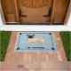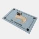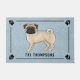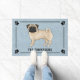 Destei's originele cartoon illustratie van een schattige vachtkleur Pug rashond. De hond staat en kijkt naar de kijker. De staart is gekruld op de bovenkant van de rug van de hond. De lichaamskleur is lichtbeige, maar er zijn donkerdere details op de oren, snuit en ogen van de hond die het uiterlijk creëren van een "zwart masker" bekend om fawn kleur Pugs. Er is ook wat donkerder schaduw op het puntje van de staart van de hond. De mond van de hond is gesloten en de oogkleur is bruin. De achtergrondkleur is blauw met een decoratieve textuur. De textuur kan worden verwijderd en de achtergrondkleur kan worden gewijzigd in een andere kleur, indien gewenst. Het ontwerp wordt omlijst door een stijlvolle rand. Er is ook een hondenpootafdruk silhouet in elke hoek. Onder het afbeelding van de hond is er een personaliseerbare tekst voor een familienaam of andere aangepaste tekst zoals "welkom", bijvoorbeeld.